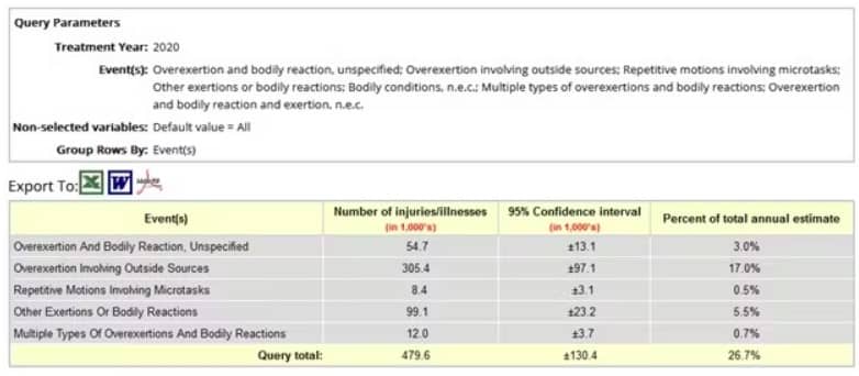 In 2020 (the most recent year of available data), nearly 480,000 occupational injuries treated in U.S. hospital emergency departments were the result of overexertion and bodily reaction, according to the Center For Disease Control and Prevention’s (CDC) Work-Related Injury Statistics Query System