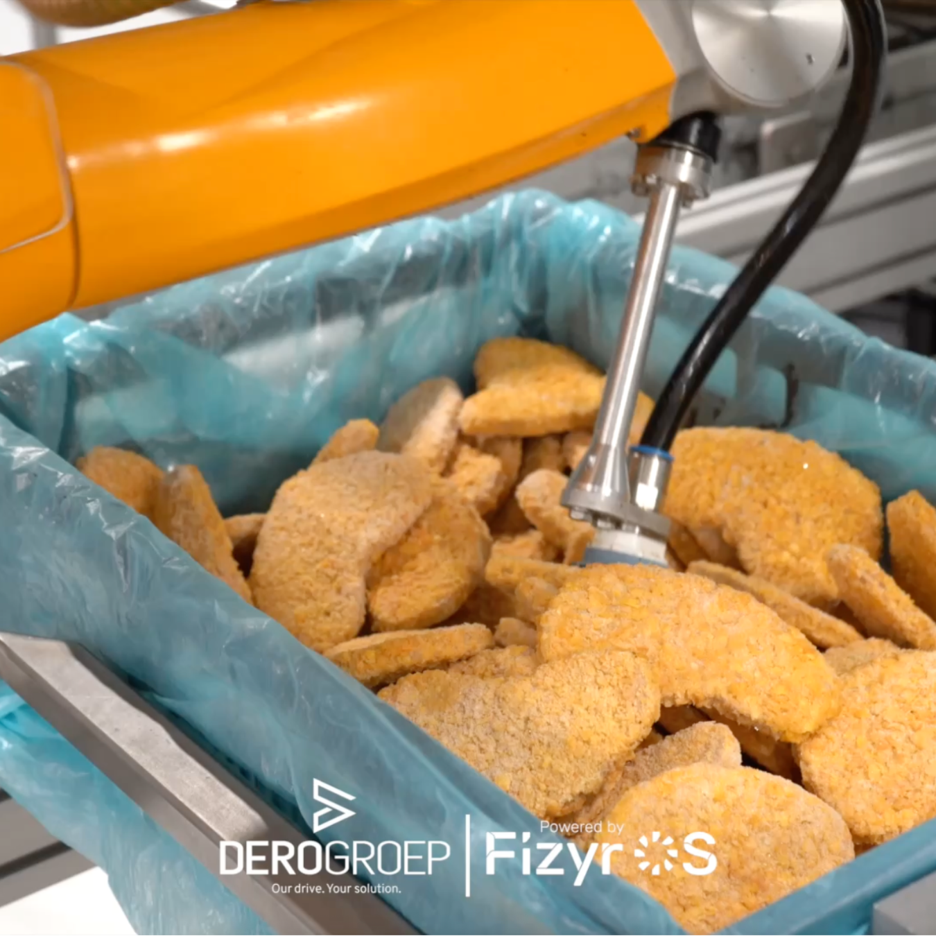 DERO GROEP’s new system automates the picking of fragile or frozen products — such as vegetarian schnitzels — from crates and places them with high precision into packaging trays. The solution is designed for environments where product variability, hygiene requirements, and process reliability are essential.